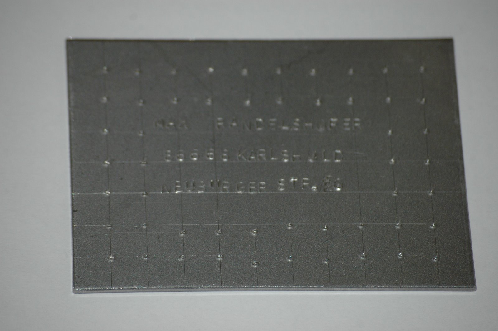 – Metall-Platini mit Name, Wohnort und Straße mit Schlagzahlen eingekörnt.