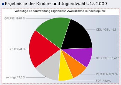 Auf vcp. de wurde das vorläufige Ergebnis der U18-Wahl in Deutschland veröffentlicht. Die U18-Wahl ist für alle Jugendliche zwischen 14 und 18 Jahren. Auch in Ingolstadt wurde ein Wahllokal eingerichtet. Hier ist die SPD mit rund 20 Prozent der klare Wahlsieger, knapp vor Grünen und CDU/CSU. Nach dieser Wahl würde es eine Rot-Grüne Regierung geben. Schwarz-gelb käme nur auf 26 Prozent kommen. Rot-Grün auf 39 Prozent. Überraschend bekamen die Piraten mehr Stimmen als die liberale FDP.