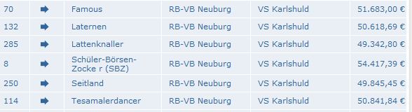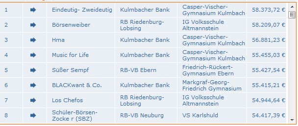 Spitzen Nachricht vom Börsenspiel der Raiffeisenbanken. Unsere Gruppe belegt Platz acht auf Bundesebene und verteidigt damit die Spitze im Landkreis Neuburg-Schrobenhausen. Das würde heißen, wenn heute das Börsenspiel beendet wäre, wir würden als Preis an die Börse nach Frankfurt/Main fahren.