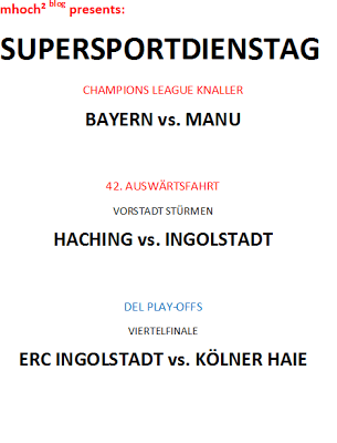 Am Dienstag erwartet uns ein Super-Sport-Dienstag. In München kreuzen der FC Bayern München und Manchester United die Klinken. Mit Robben oder ohne, steht noch nicht fest. Es ist das Spiel des Jahres zumindest für Bayern. Die haben bei der Niederlage in Stuttgart schon einen herben Rückschlag im Kampf um die Meisterschaft erlitten.Das zweite Highlight: die 42. Auswärtsfahrt nach Unterhaching. Unter dem Motto „Vorstadt stürmen“ versucht der FC04 wieder dreifach zu punkten in Unterhaching. Ingolstadt reist als beste Auswärtsmannschaft an.Das dritte Highlight ist: der ERC Ingolstadt trifft in den Play-offs auf die Frankfurt Lions. Falls die Ingolstädter Eishockey-Cracks weiterkommen würden müssten sie gegen den Meister Eisbären Berlin ran. Aber erstmal gegen Frankfurt spielen.Ein Supersportdienstag mit dreifacher bayerischer Beteiligung. Es wird großartig!