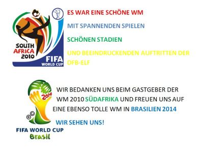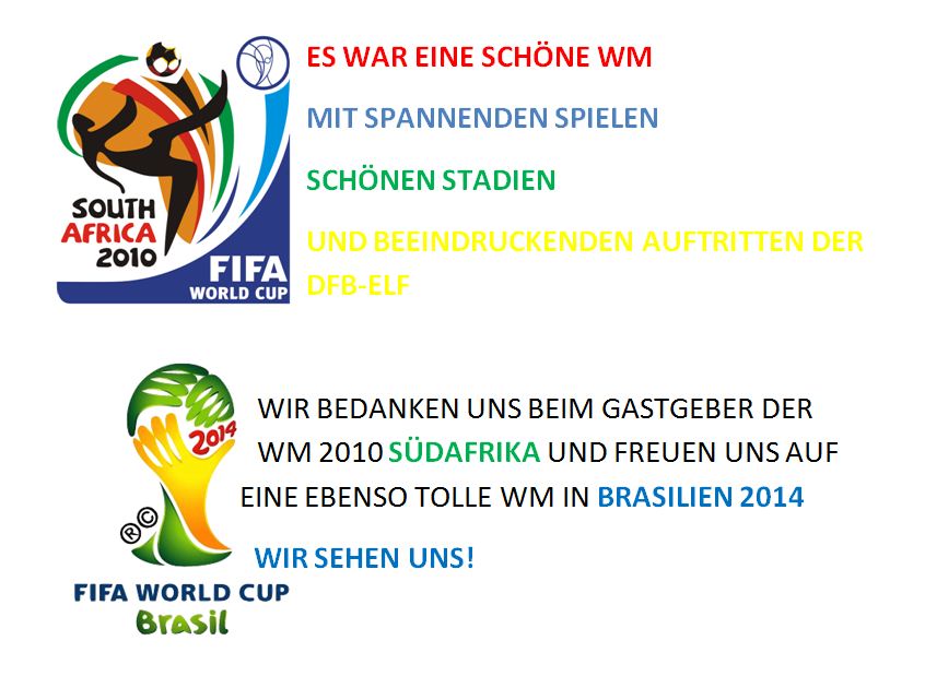 Die WM ist vorbei und Spanien ist Weltmeister. Wir bedanken uns bei dem Veranstalter der WM: Südafrika. Wir bedanken uns für tolle Spiele, tolle Stimmung und super Organisation!
