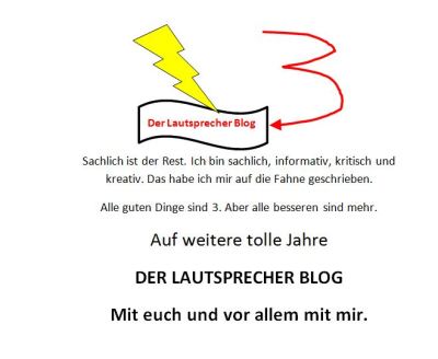 Big, Bang, Boom, Der Lautsprecher Blog wird 3 Jahre alt. 3 Jahre, keineswegs alt, aber das ist für einen Blog schon eine Hausnummer. 831 Posts wurden in 3 Jahren gepostet. Am 20. November 2008 erblickte der „Der Jungen Wilden Blog“, wie er damals hieß das Licht der Webwelt. Anfangs natürlich recht sperrliche Posts. Auf der Suche nach Themen und einer klaren Struktur. Es folgte eine Ordnung nach Rubriken, Gadgets am Rand, die den Blog interessanter und attraktiver machen sollten. Die erste Umbenennung folgte dann im Jahr 2010 von „Der Jungen Wilden Blog“ in „mhoch2 Blog“ dann bekam der Blog seinen heutigen Namen: „Der Lautsprecher Blog.“ Passend zur Eigenauffassung. Themen sachlich aber mit Schärfe ansprechen.
