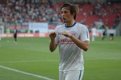 | Ballgespielt meint Rostocks Übeltäter. Doch das Schiedsrichtergespann plädierte auf Strafstoß. |
