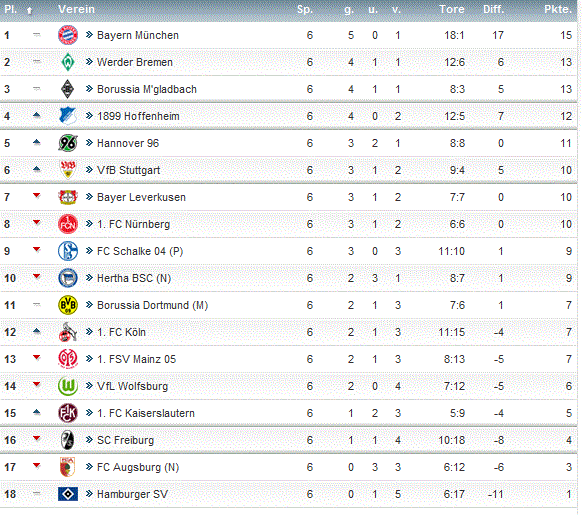 Im Tiefflug befindet sich weiterhin Freiburg. Die Freiburger wurden letzte Woche 7:0 gegen Bayern abgefertigt und kassierten im Derby gegen Stuttgart wieder eine Niederlage. Auch im tiefen Abstiegssumpf bleibt der Traditionsverein Hamburger SV. Sie verloren gegen die aktuell im Höhenflug spielenden Gladbacher mit 0:1. Gladbach beißt sich oben in der Spitzengruppe fest. Die HSV-Verantwortlichen halten weiter an ihrem Trainer Oenning fest. Wie lange der allerdings noch auf seinem Stuhl sitzt ist ungewiss. Der HSV steckt in einer handfesten Krise.