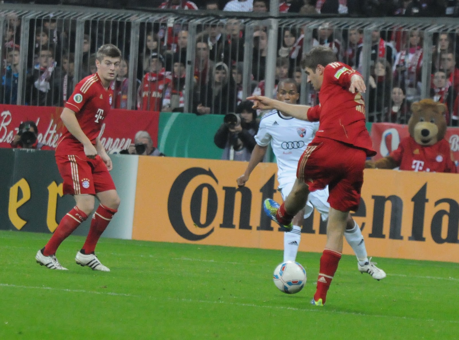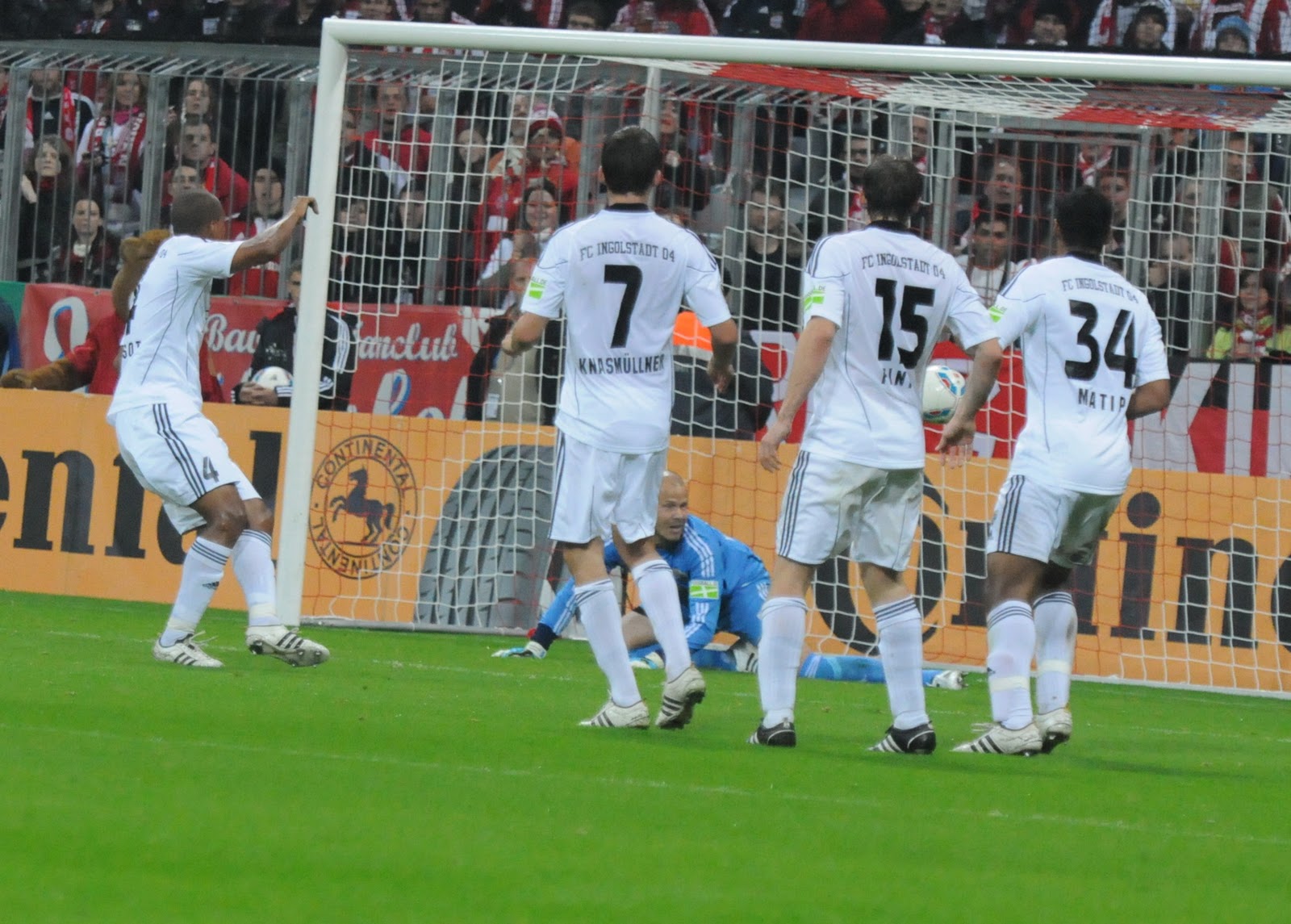 30 Minuten lang halten meine Schanzer mutig dagegen. Bayern kommt zu Chancen. Pisot klärt einen Ball auf der Linie. Die über 6.000 mitgereisten Ingolstädter Fans hatten den Ball schon im Tor von Kirschstein gesehen. In der 33. Minute hatte Bayern das Glück des Tüchtigen. Müller zieht ab, Pisot fälscht unhaltbar ab: 1:0 für Bayern. Jetzt geht das Schützenfest wohl los. Unglücklicher kann man kein Gegentor bekommen. Die Ingolstädter zeigten eine bis dato gute defensive Leistung, doch nach vorne passierte einfach zu wenig, eigentlich gar nix. Aber 33 Minuten gegen Bayern zu Null, das können nicht viele von sich behaupten in dieser Saison.