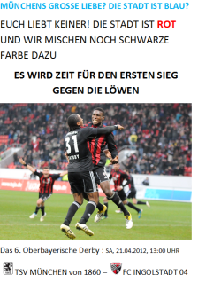 Doch die Auswärtsfahrten-Saison ist noch nicht vorbei. Am Sonntag, den 21.04 geht´s nach München zum Rivalen TSV 1860. Aufgeht´s Schanzer zum ersten Derby-Sieg gegen die Kätzchen.