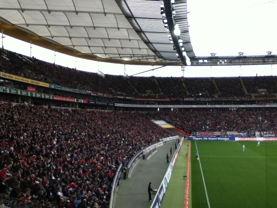 Es ging zur Eintracht. „Schreim ma drei“ war das Motto. Natürlich stets selbstbewusst. Die Organisation in Frankfurt stellte sich als chaotisch und nicht erstligareif heraus. Ewiges Kreisen um das Stadion herum, bis man dann endlich dorthin kam wohin man wollte. Naja. Das Stadion war natürlich beeindruckend. Das zweitgrößte der Liga (1. Düsseldorf, 54.600, 2. Frankfurt 51.500) und natürlich die Mannschaft die garantiert aufsteigen wird. Egal wie dieses Spiel ausgehen würde. 38.500 Zuschauer sollten sich am Ende ins Waldstadion einfinden. Dort wurde bereits WM-Fußball gespielt, auch Erste Liga. Dort hin wollen sie wieder. Und wir wollten dem ambitionierten Verein die Reise in Liga eins natürlich nicht so leicht machen. Die Eintracht legte ordentlich los und dominierte was die Spielanteile anging, die Partie. Wir erweckten nie den Eindruck, dass wir Eintracht hier gefährden könnten. Zu betonen ist auch, dass die Eintracht bisher zuhause noch ungeschlagen ist. Doch so richtig Angst erweckte die Eintracht nicht. Wir verteidigten gut und konnten so mit 12,5 ungeschlagenen Spielen in die Halbzeit gehen: 0:0.