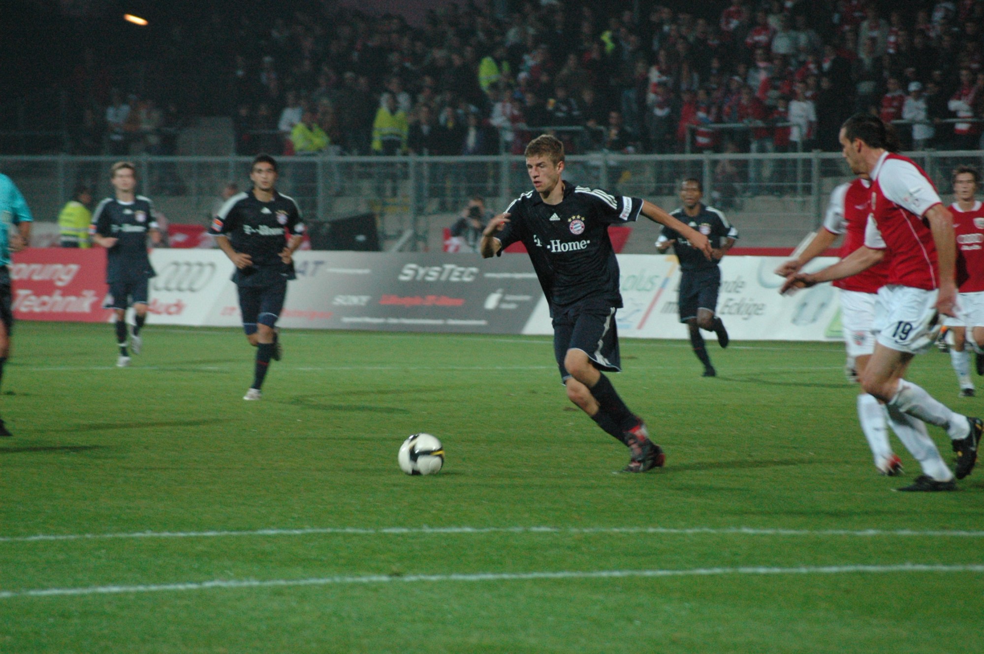 Heute starten wir mit einem Foto aus der Saison 2008/2009. Die Schanzer empfingen damals den FC Bayern München zu einem Testspiel ins ESV-Stadion. Die Bayern damals noch von Jürgen Klinsmann trainiert traten mit einer B-Truppe auf. Unter anderem dabei, ein damals noch recht unbekannter: Thomas Müller. Auf dem Bild sieht man ihn Richtung Sechszehner laufen, Malte Metzelder ist dran an ihm. Damals dachte wohl kaum einer das Müller einer der künftigen deutschen Weltstars wird. Das Spiel gewannen am Ende die Schanzer mit 1:0. Den Bayern wurden die Lederhosen ausgezogen. Allerdings stiegen die Schanzer am Ende trotzdem mit erhobenen Fahnen wieder in die dritte Liga ab. Sei´s drum. Einmal haben wir die Bayern geschlagen. Zwar in einem Testspiel. Aber Sieg ist Sieg.
