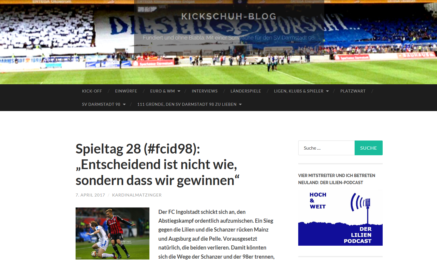 Matthias Kneifl, Autor des Buches „111 Gründe den SV Darmstadt 98 zu lieben“ und Autor des Kickschuh-Blog hat mich vor unserem Spiel gegen die Lilien befragt. U. a. ging es um die aktuelle Form der Schanzer, meine Prognose fürs Spiel und meine Sicht auf die Saison der Lilien.