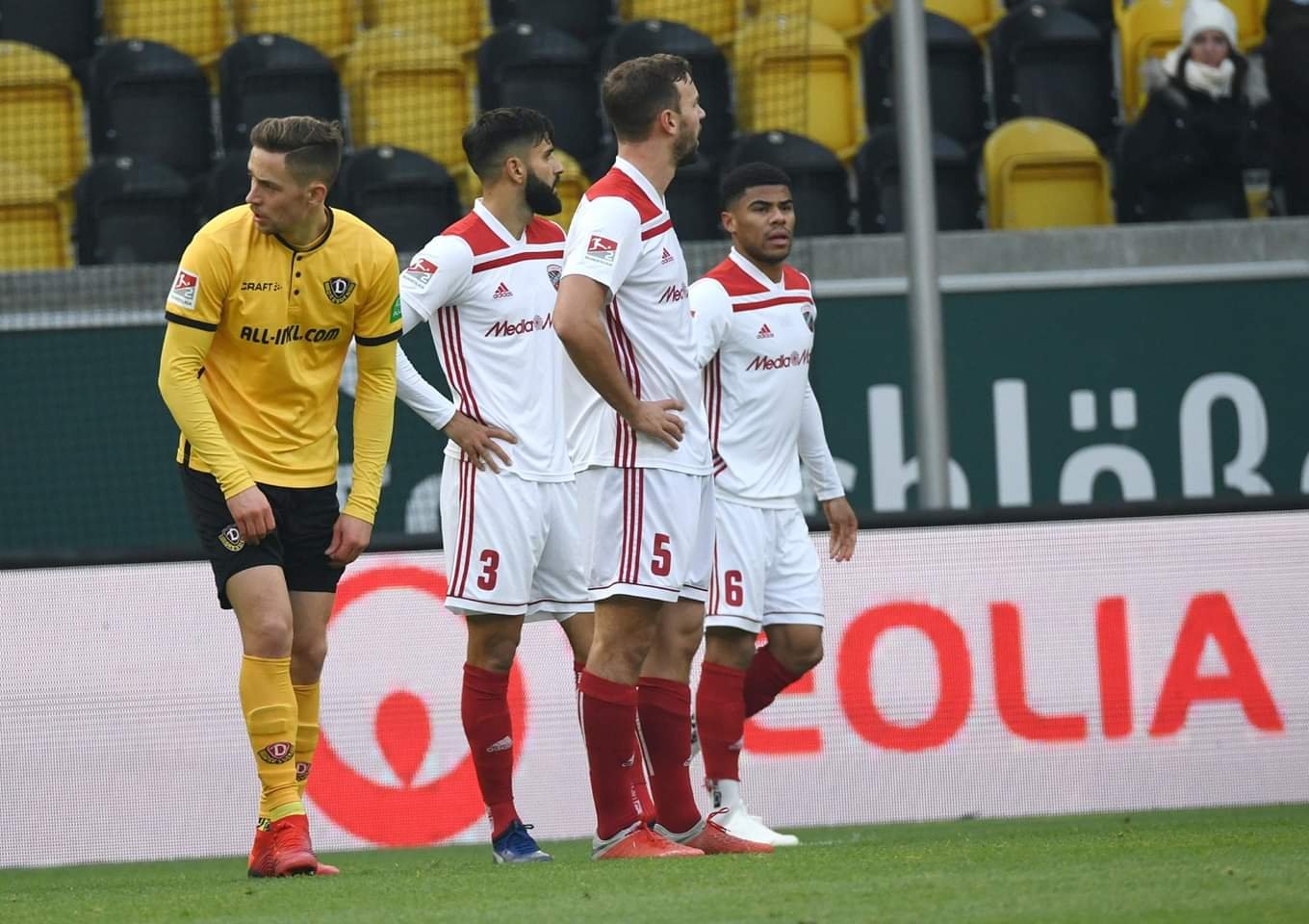 Die Leistung der Mannschaft auf dem Platz insbesondere in der ersten Halbzeit war über weite Strecken ein Fiasko. Bereits nach fünf Minuten war der Matchplan der Schanzer pulverisiert. Neumann foulte Koné, Elfmeter für die SGD. Und als wäre das nicht schon genug, sieht Neumann die Rote Karte. Den Platzverweis kritisieren einige zu Recht als überzogen. Denn die Doppelbestrafung ist nach den neuen Regeln eigentlich abgeschafft. Diese Rote Karte zerlegte die Schanzer Defensive komplett. Denn das 2:0 fiel nur wenig später. Ex-Schanzer Patrick Ebert überspielte die komplette FCI-Abwehr und Koné traf zum 2:0. Große Verwirrung herrschte deswegen auf dem Platz, weil scheinbar viele dachten Koné stehe im Abseits. Koné stand auf gleicher Höhe und die Schanzer hoben obendrein wegen eines Stellungsfehlers das Abseits selbst auf.