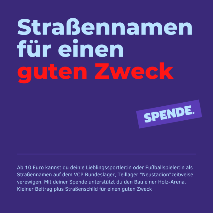 Du wolltest schon immer einmal eine Straße nach deinem Lieblingsspieler benennen? Dann hast du JETZT dazu die Möglichkeit. Im August findet auf dem Zeltplatz Großzerlang in Brandenburg, das Bundeslager des VCP statt. Rund 4000 Teilnehmende aus Deutschland und der Welt verbringen dort eine gute Zeit unter dem Motto "Neustadt." Rund 450 Teilnehmende sind im Sport-Teillager … Für einen guten Zweck. Kaufe Straßennamen mit deinen Lieblingsspielern weiterlesen